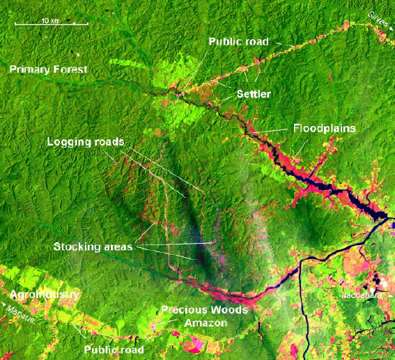 *Logging was analyzed without considering land investment and/or timber processing at sawmill. Ländliche Familien roden im Durchschnitt fünf Hektar Fläche zum Anbau von Grundnahrungsmitteln, die sie im Rotationsprinzip nutzen13, während etwa die zehnfache Fläche Wald als Produktionsfläche von Nichtholzprodukten erhalten bleibt. Precious Woods Amazon verwandelt 2.700 Hektar innerhalb der Forstfläche in Transportinfrastruktur. Dies entspricht einer Rodungsfläche, die rein rechnerisch zur Existenzsicherung von 540 traditionellen Familien ausreicht. Wird die benötigte Fläche pro Arbeitskraft berücksichtigt, zeigt sich die soziale Ineffizienz der Holzwirtschaft noch deutlicher (siehe Tabelle ). Die Firma Precious Woods Amazon beschäftigt mit dem geplanten Einschlagszyklus von 30 Jahren gegenwärtig 300 Menschen in einem Forstgebiet von 61.000 Hektar Grösse. Um also das Problem der geschätzten 10.000 Arbeitslosen in Itacoatiara zu lösen, müssten 2.030.000 Hektar Primärwald zum Holzeinschlag freigegeben werden. Man stelle sich die benötigte Waldfläche vor, um die Probleme der Arbeitslosigkeit in Manaus zu lösen! Der effektive Landverbrauch von Precious Woods ist aber weit größer. Aufgrund des geringen Gehalts bemühen sich viele Arbeiter zusätzlich um kleine Landparzellen, die sie roden um ihre Bedürfnisse zu erfüllen. Zudem essen jeden Tag 300 Arbeiter das Essen aus der Betriebskantine, das auf Feldern und in Viehfarmen entlang der Verbindungsstraße zwischen Itacoatiara und Manaus produziert wird. Die Auswirkungen dieser städtischen Verbrauchsmuster zeigen sich in dem breiter werdenden entwaldeten Streifen beiderseits der Straße, den man auf Satellitenbildern deutlich erkennen kann.